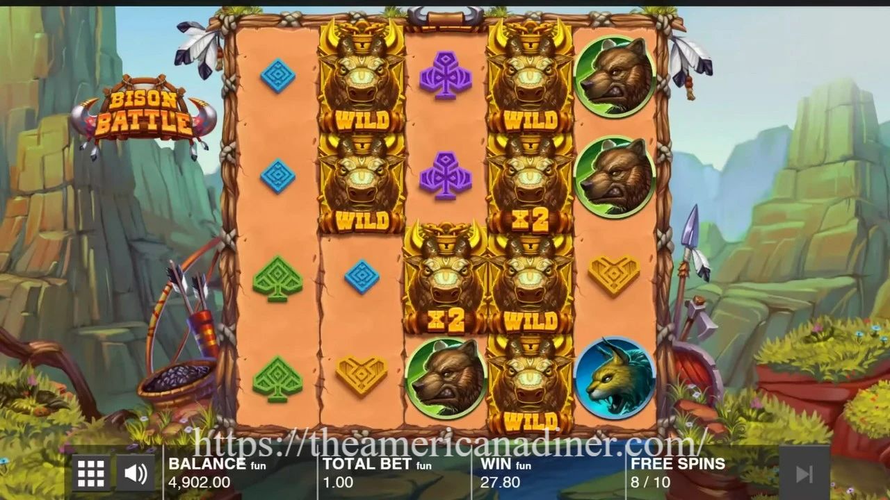 Bison Battle menampilkan latar padang rumput luas dengan matahari terbenam, pegunungan, dan efek angin yang dinamis. Simbol yang muncul di gulungan meliputi: